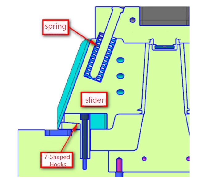 In many Haff designs, the initial separation force is provided by springs (typically sleeved on the angular guide pins). However, to ensure absolute reliability, "7-shaped" pull hooks should be integrated to mechanically pull the sliders back toward the B-plate during the mold opening sequence, preventing the slider from getting stuck.