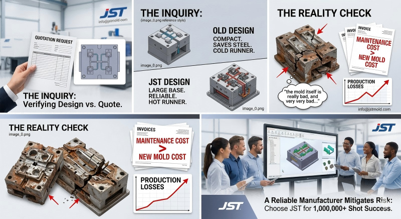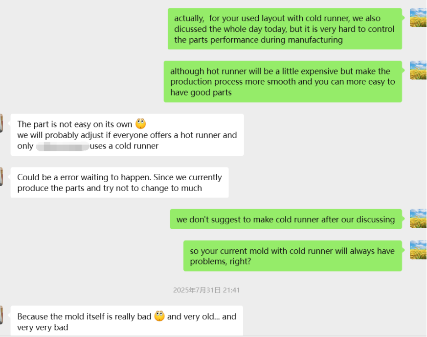 Looking back at the client’s feedback: the old mold with the problematic layout and cold runner system incurred maintenance costs over the past 12 months that were higher than the cost of building an entirely new mold. The actual losses went far beyond the high repair expenses — they also included significant downtime, lost production time, and opportunity costs. For high-volume or critical projects, the consequences would have been even more severe. The client emphasized: “The mold itself is really bad, and very very bad.” Their experience was extremely disappointing.