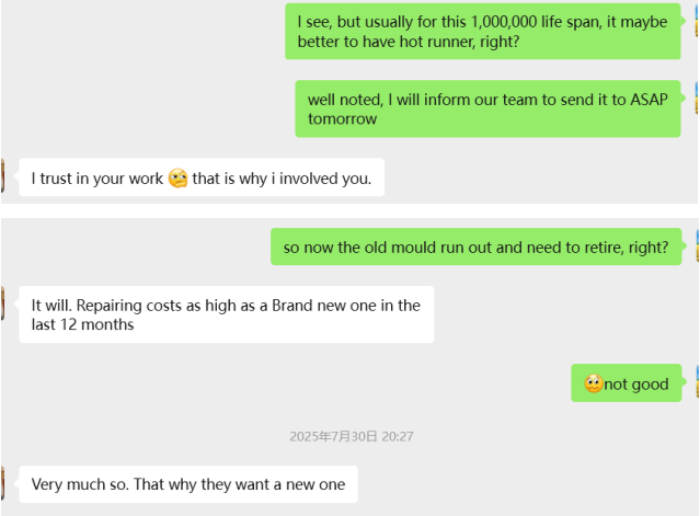 On the other way, if the mold couldn’t work, it will stop the production, which will delay the parts delivery to your customers or delay new products launching to market. What are the worse result can you image? This will make you loss lots of money too.