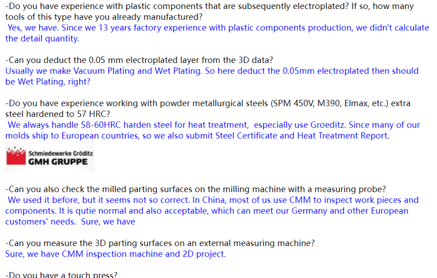 You can propose various professional questions based on your company’s specific needs and see how the Chinese mold manufacturer replies.