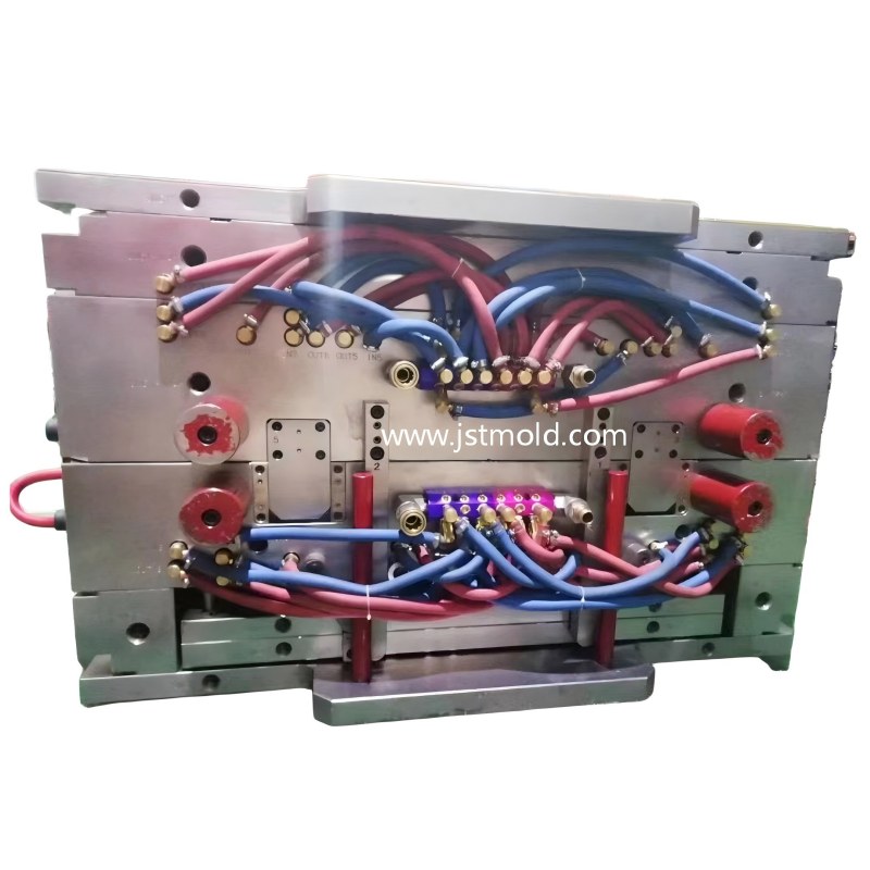The intricate network of high-flow cooling lines and electrical connectors shown here demonstrates JST Mold’s expertise in advanced thermal management and hot runner integration. Our engineering team utilizes precision-balanced manifolds to ensure uniform material flow and rapid heat dissipation across large surface areas. Constructed with premium hardened tool steels (HRC 48-54), this mold is built for long-term industrial reliability. Every component is meticulously checked to meet IATF 16949 quality standards, ensuring that micron-level tolerances and Class-A surface requirements are maintained throughout high-volume mass production cycles.